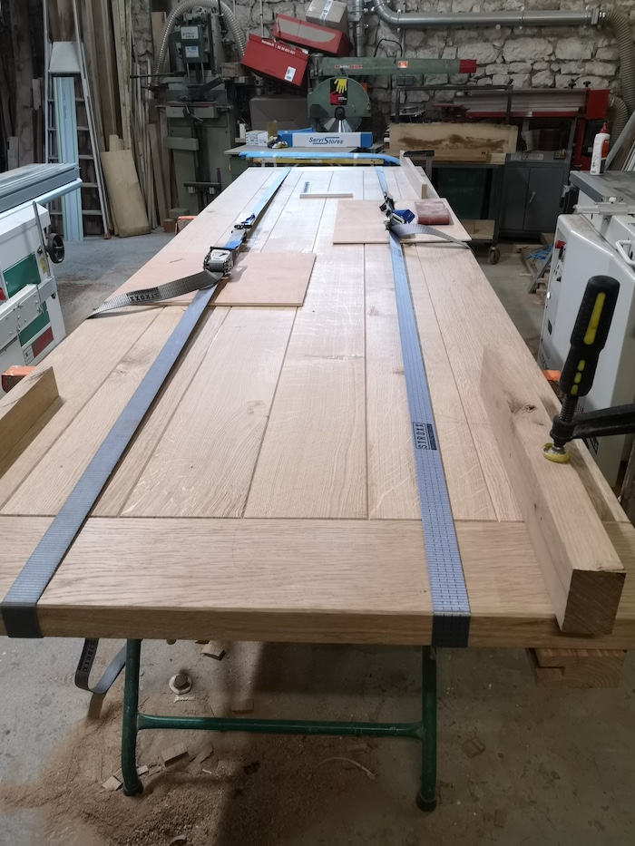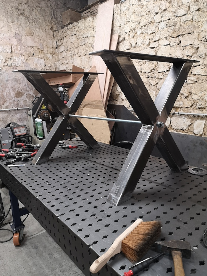 Fabrication du piètement en structure acier vernis pour avoir le minimum d’encombrement pour les jambes.