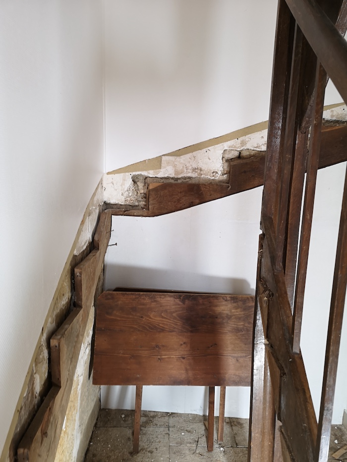 Dépose des anciennes marches et contremarche en sapin pour retrouver les limons à nu.